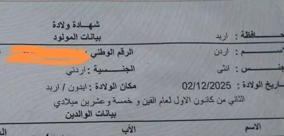 مواطن يسمي ابنته "أردن" احتفاءً بتأهل النشامى .. وثيقة