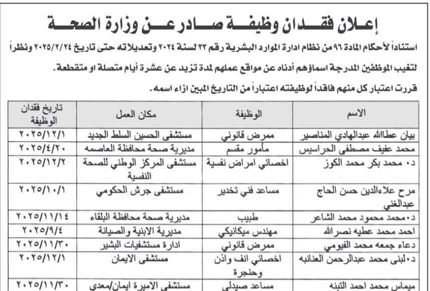 أخبار البلد -   قررت وزارة الصحة اعتبار الموظفين المدرجة أسماؤهم أدناه فاقدين لوظائفهم، وذلك بسبب تغيبهم عن مواقع عملهم لمدة تزيد على عشرة أيام متواصلة أو متقطعة، استنادًا إلى أحكام المادة (96) من نظام إدارة الموارد البشرية رقم (33) لسنة 2024 وتعديلاته