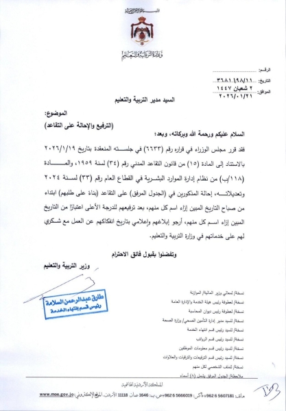أخبار البلد - قرر مجلس الوزراء الموافقة على إحالة الموظفين المذكورين تالياً بعد ترفيعهم للدرجة الأعلى إلى التقاعد بناء على طلبهم.