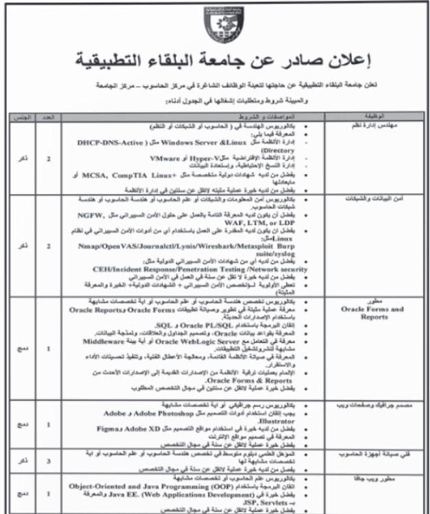 اعلنت جامعة البلقاء التطبيقية اليوم الاثنين عن حاجتها لتعبئة وظائف شاغرة.