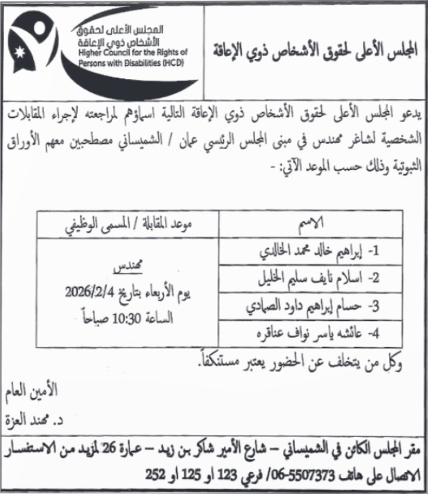 يدعو المجلس الاعلى لحقوق الاشخاص ذوي الاعاقة التالية اسماؤهم لاجراء المقابلات الشخصية.