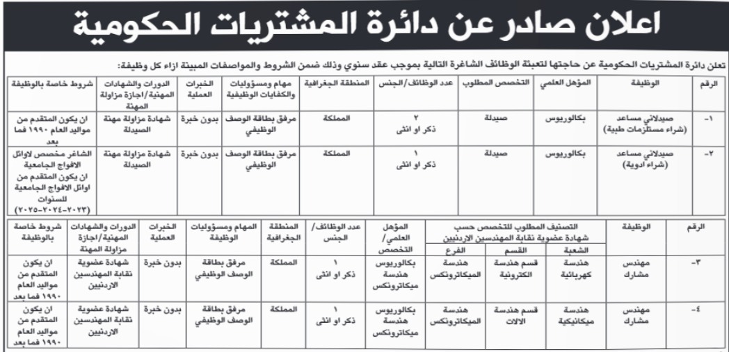 اعلنت دائرة المشتريات الحكومية، اليوم الاحد، عن حاجتها لتعبئة وظائف شاغرة.