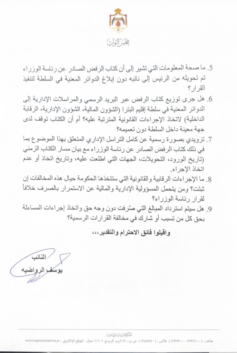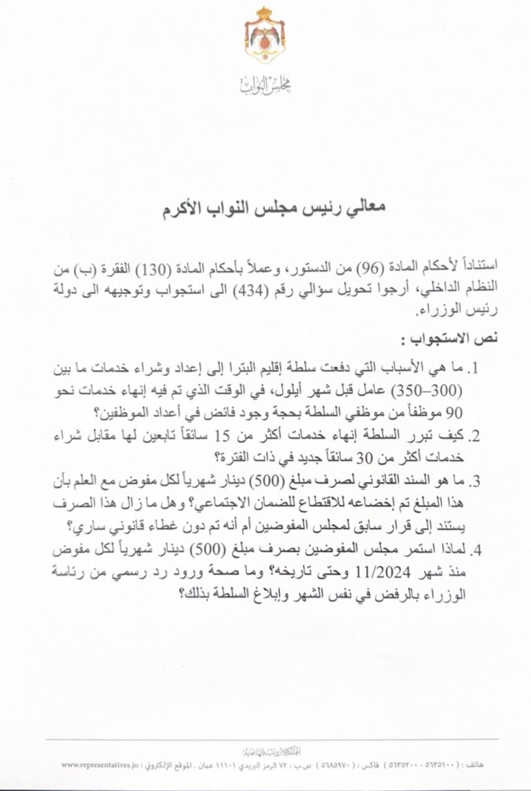 النائب يوسف الرواضية يحول سؤاله النيابي عن اقليم البترا الى استجواب رسمي للحكومة  وثائق
