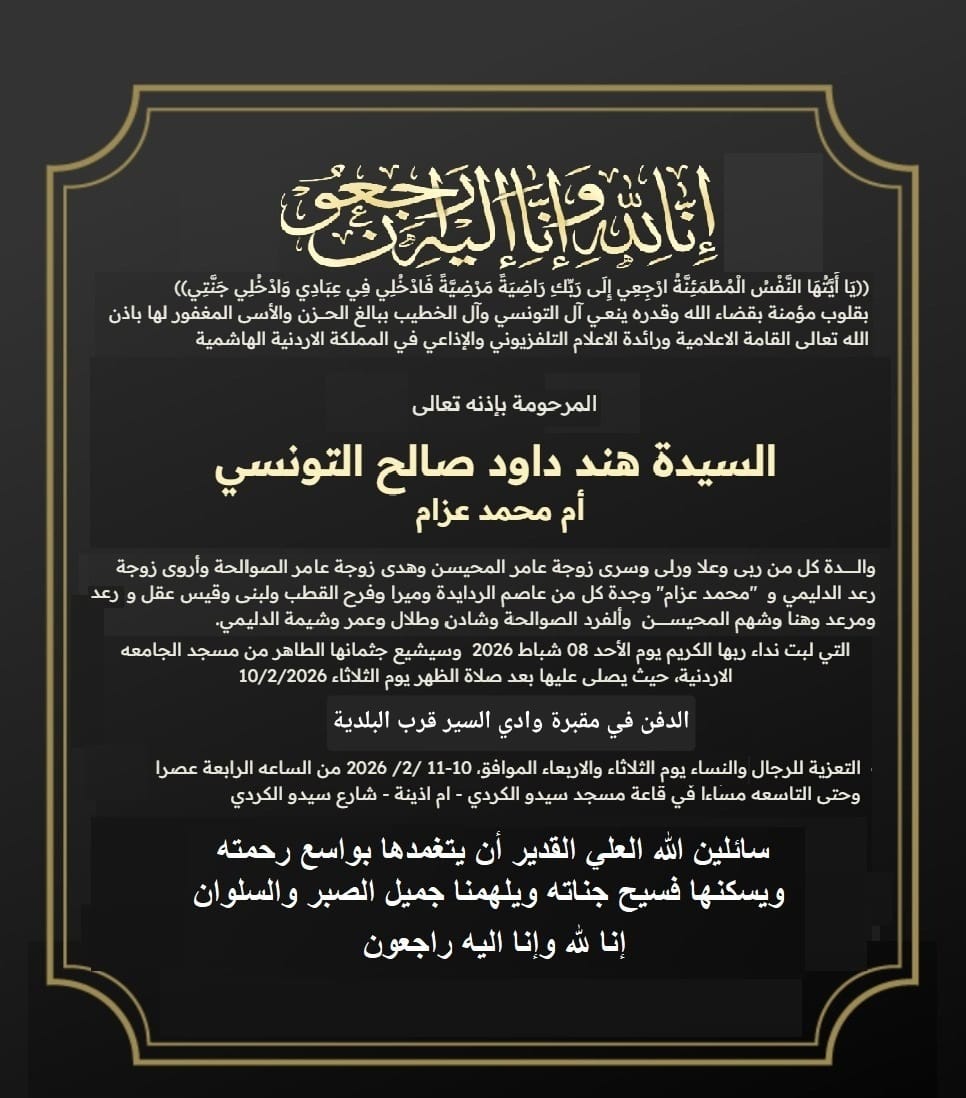 انتقلت إلى رحمة الله تعالى، يوم الأحد الموافق 8 شباط 2026، الإعلامية والشاعرة والكاتبة والباحثة السياسية الفلسطينية البارزة هند داوود صالح التونسي (أم محمد عزام)، بعد مسيرة طويلة شكّلت خلالها إحدى العلامات الفارقة في المشهد الإعلامي والأدبي الأردني والعربي.