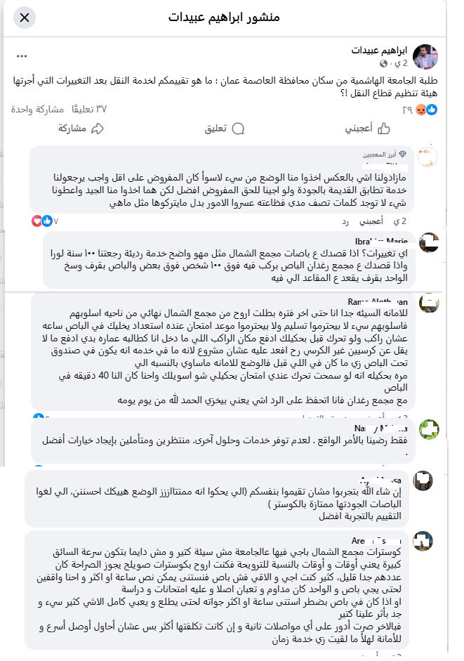 وجاء في تعليق لـ ابراهيم مستفسرا: اي تغييرات؟ اذا قصدك ع باصات مجمع الشمال مثل مهو واضح خدمة رديئة رجعتنا ١٠٠ سنة لورا ، واذا قصدك ع مجمع رغدان الباص بركب فيه فوق ١٠٠ شخص فوق بعض والباص بقرف وسخ الواحد بقرف يقعد ع المقاعد الي فيه.