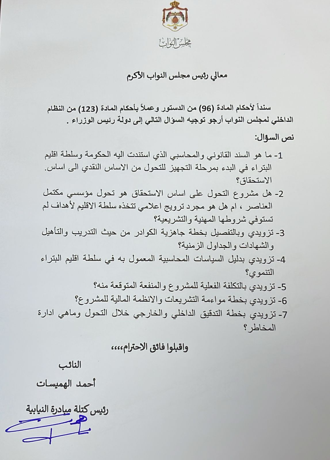 وتاليا نص السؤال الذي وجهه النائب احمد الهميسات الى مجلس النواب