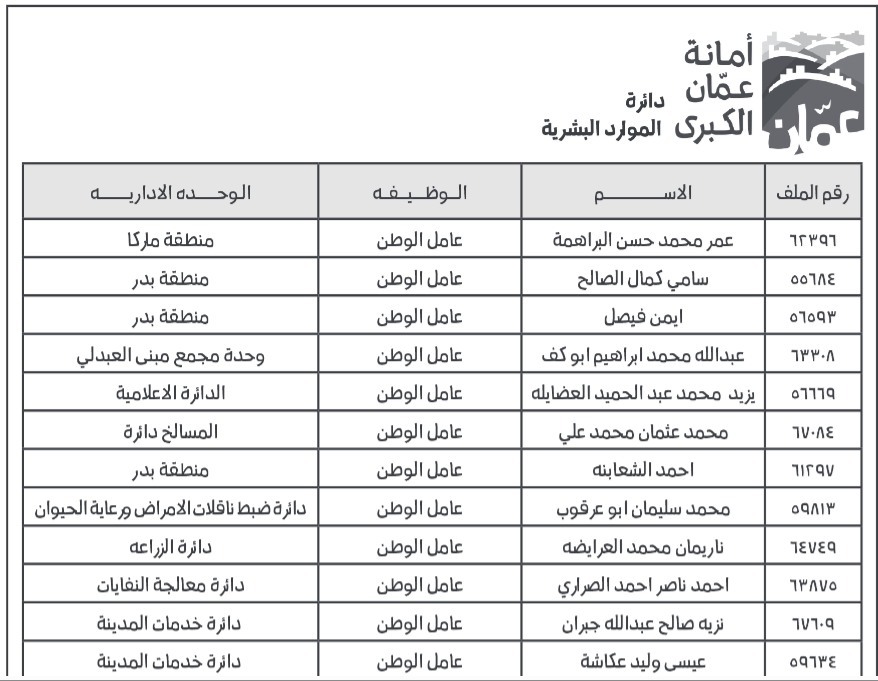 وجّهت أمانة عمّان الكبرى، اليوم الأحد، إنذارًا لعدد من العمال والموظفين المتغيبين عن أعمالهم.