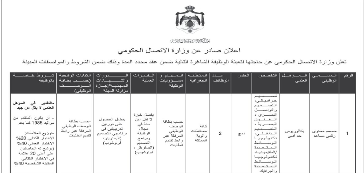 اعلنت وزارة الاتصال الحكومي، اليوم الاثنين، عن حاجتها لتعبئة وظائف شاغرة.
