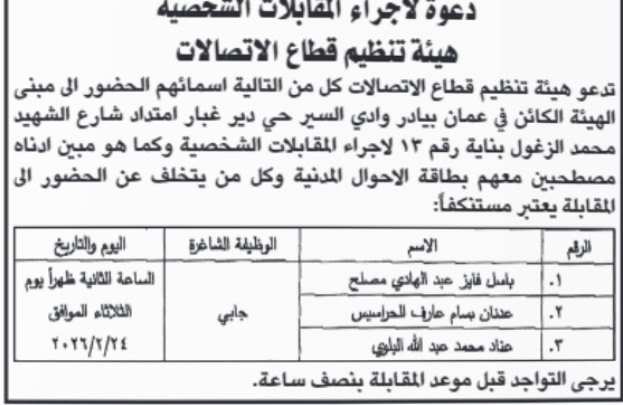 تدعو هيئة تنظيم قطاع الاتصالات اليوم الثلاثاء التالية اسماؤهم لاجراء المقابلات الشخصية