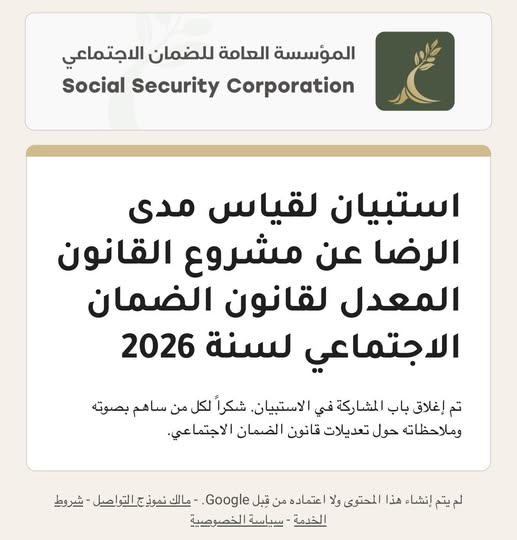 أخبار البلد - أوقفت المؤسسة العامة للضمان الاجتماعي المشاركة في الاستبيان الإلكتروني الذي طرحته عبر موقعها الرسمي لاستطلاع آراء المواطنين حول التعديلات المقترحة على قانون الضمان الاجتماعي لسنة 2026.