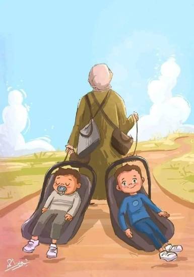 "الأم البطلة" تسحب طفليها 5 ساعات متواصلة في رحلة نزوح قاسية