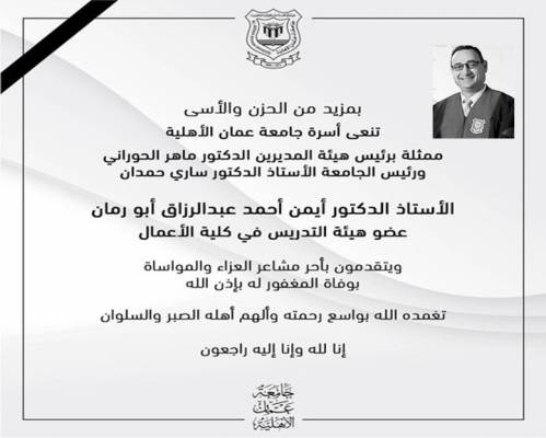 أسرة جامعة عمان الأهلية تنعى فقيدها المرحوم أ.د. أيمن أبو رمان