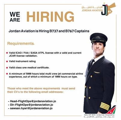 الأردنية للطيران تعلن عن توفر شواغر لقائد طائرة لأنواع الطائرات التالية : Boeing 767 + Boeing 767 التفاصيل حسب الأعلان المرفق