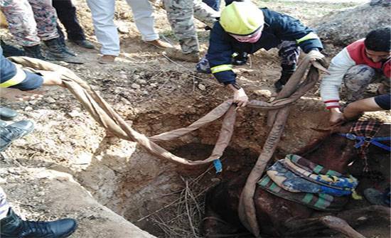 بالصور : الدفاع المدني ينقذ حصان وقع داخل حفرة في عراق الأمير