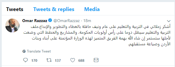 الرزاز يودع التربية ويثني على جهود العاملين بها