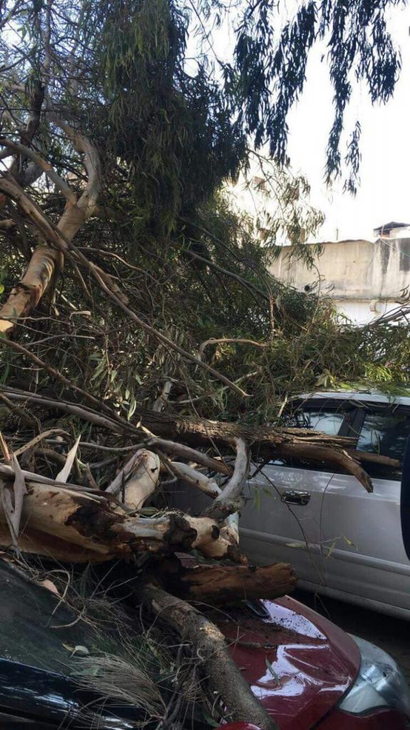 شاهد بالصور.. شجرة تحطم عدة سيارات في اربد بعد سقوطها