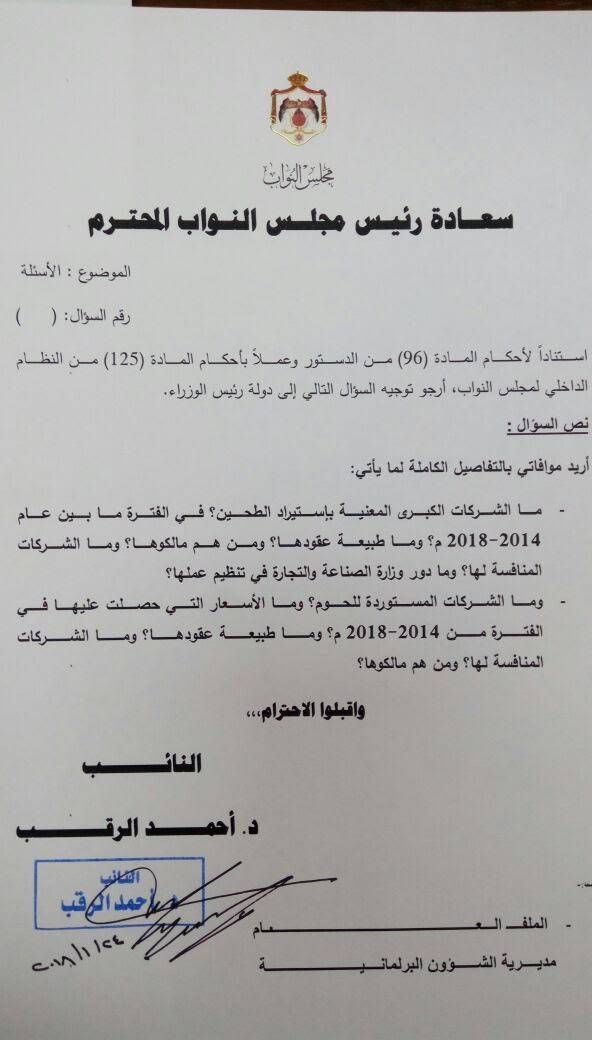 الرقب يسأل الحكومة حول الشركات المستوردة للطحين واللحوم