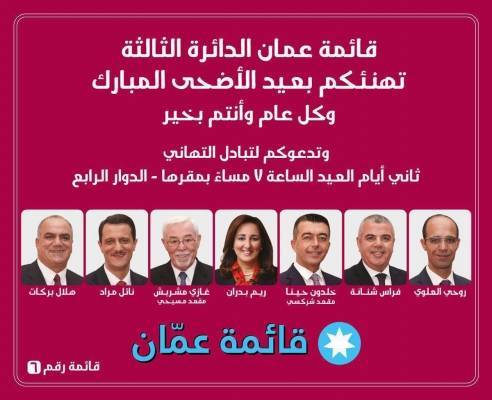 قائمه عمان تهنئ بعيد الأضحى المبارك وتدعو لتبادل التهاني في مقرها