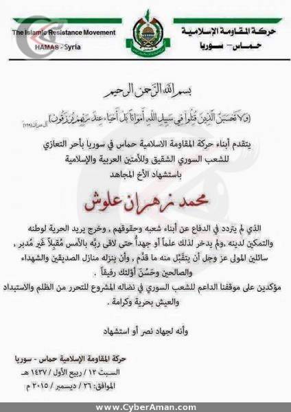 بالصورة - حركة حماس تنعي و تلطم الإرهابي زهران علوش
