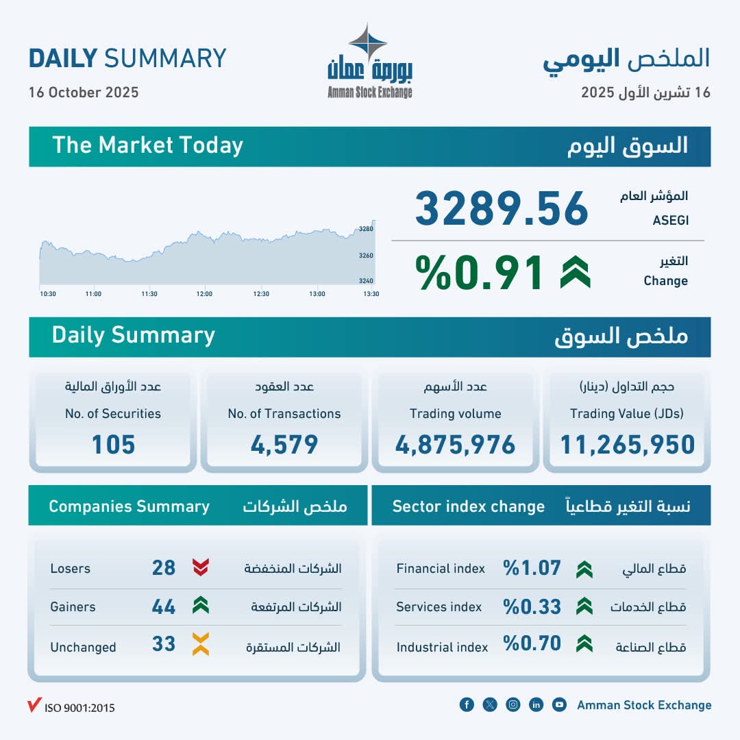 بورصة عمّان: ارتفاع المؤشر العام 0.91% وحجم التداول 11.3 مليون دينار اليوم الخميس