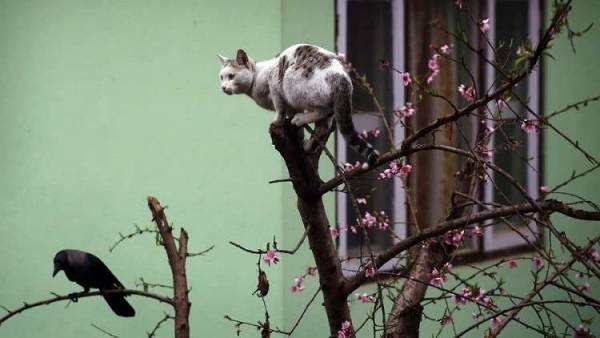 غراب بطل يوقف معركة شرسة بين قطتين! فيديو