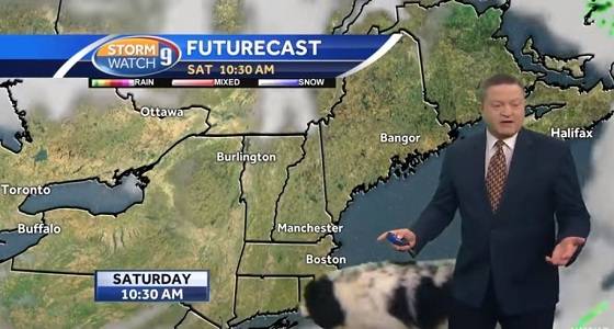 بالفيديو.. كلب يفاجأ مذيع نشره جوية ويظهر معه على الهواء