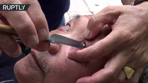 حلاق صيني ينظف عيون زبائنه بسكين! فيديو