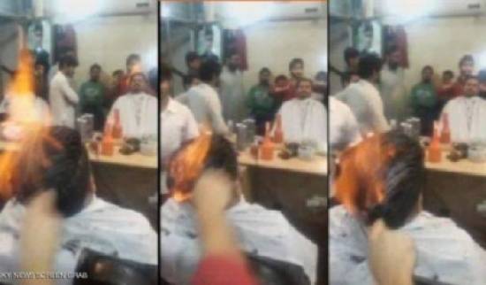 حلاق يقص شعر زبائنه بالنار (للقلوب القوية فقط) ... فيديو