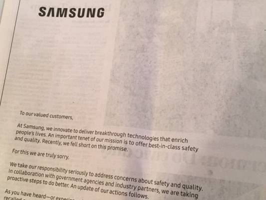 سامسونج تنشر اعتذارًا رسميًا عن “النوت 7” على أكبر 3 صحف أمريكية