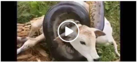 بالفيديو:لقطات مرعبة لأفعى ضخمة تنقض على بقرة صغيرة