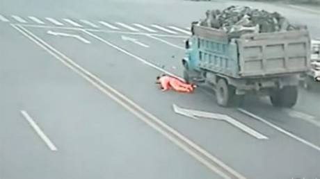 فيديو يحبس الأنفاس.. نجاة صيني من الموت تحت عجلات شاحنة