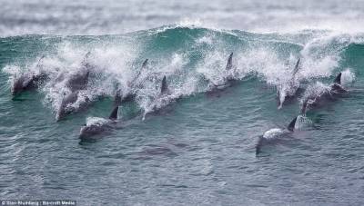 بالصور.. دلافين تتنافس وتركب الأمواج مثل البشر