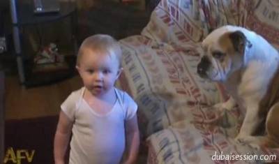 صور | طفل رضيع يدخل في مناقشة حادة مع كلب ويصيبه بالإحباط