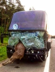 صور: رأس غزال مخمور يخترق زجاج حافلة