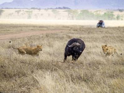 بالصور.. معركة شرسة على حب البقاء بين 11 أسدًا وذكر جاموس لمدة 20 دقيقة
