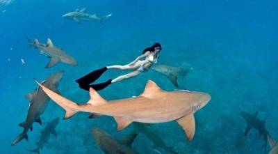 إمرأة تسبح شبه عارية بين أسماك القرش