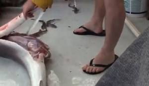 فيديو مميز.. أسماك صغيرة تقفز من بطن سمكة قرش أثناء تنظيفها