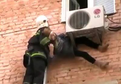 بالفيديو.. معمرة تسقط من نافذة بيتها وتتعلق بمثبت جهاز التكييف