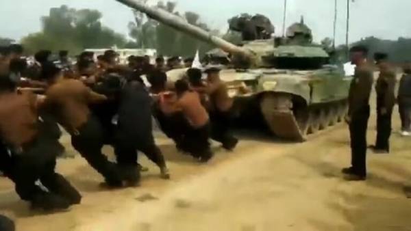 الجنود الهنود يقطرون دبابة "تي - 90" يدويا