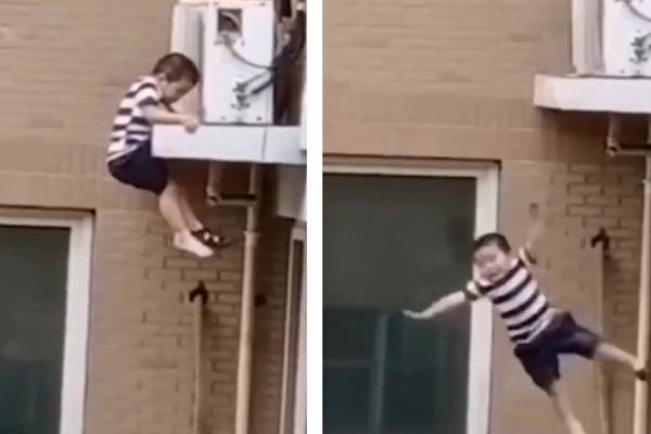 شاهد.. طفل يسقط من الطابق الخامس فينجو بأعجوبة