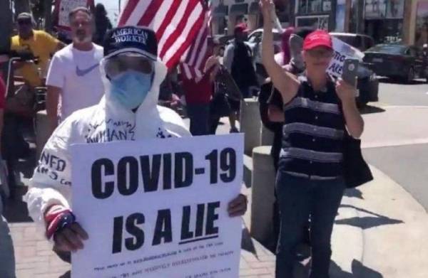 طرائف كورونا.. أميركي يرتدي بدلة واقية ويطالب بإلغاء الحظر