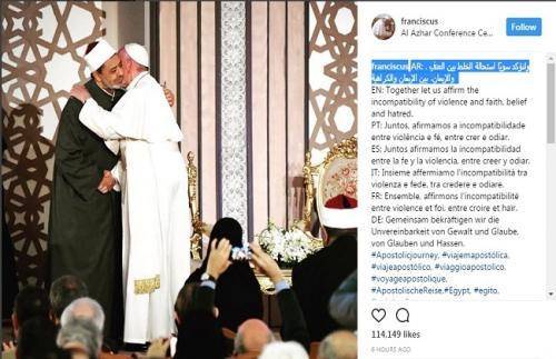 بماذا علق بابا الفاتيكان على صورته وهو يعانق شيخ الأزهر ؟