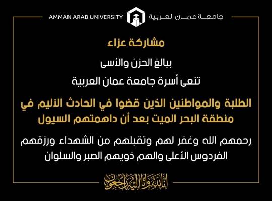 أسرة جامعة عمان العربية تنعى الطلبة والمواطنين الذين قضوا في الحادث الأليم في منطقة البحر الميت