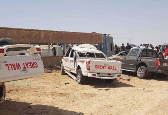 بالصور ..تدهور شاحنة محملة بالمركبات في الصحراوي