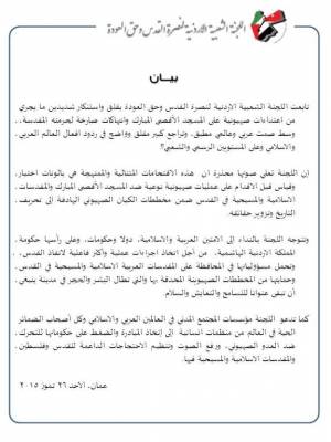 اللجنة الشعبية الاردنية لنصرة القدس تستنكر