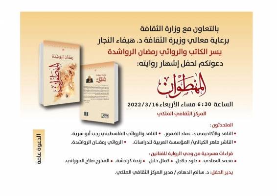 حفل اشهار رواية المهطوان لرمضان الرواشدة الاربعاء..