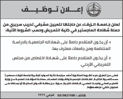 جـامعـة الـزرقـاء تعلن عن حاجتها لتعيين مشرفي تدريب سريري من حملة شهادة الماجستير في كلية التمريض