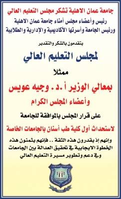 جامعة عمان الاهلية تشكر مجلس التعليم العالي
