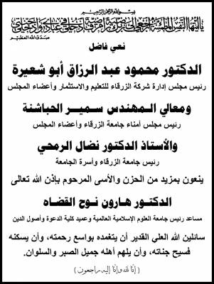 جامعة الزرقاء للتعليم والاستثمار تنعى الدكتور هارون نوح القضاه