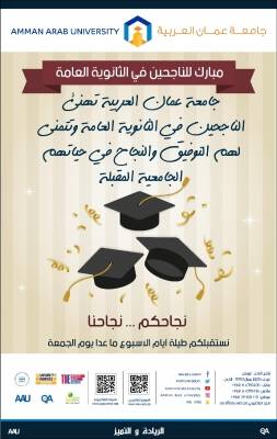 جامعة عمان العربية تهنىء الناجحين في الثانوية العامة ويتمنون لهم التوفيق والنجاح